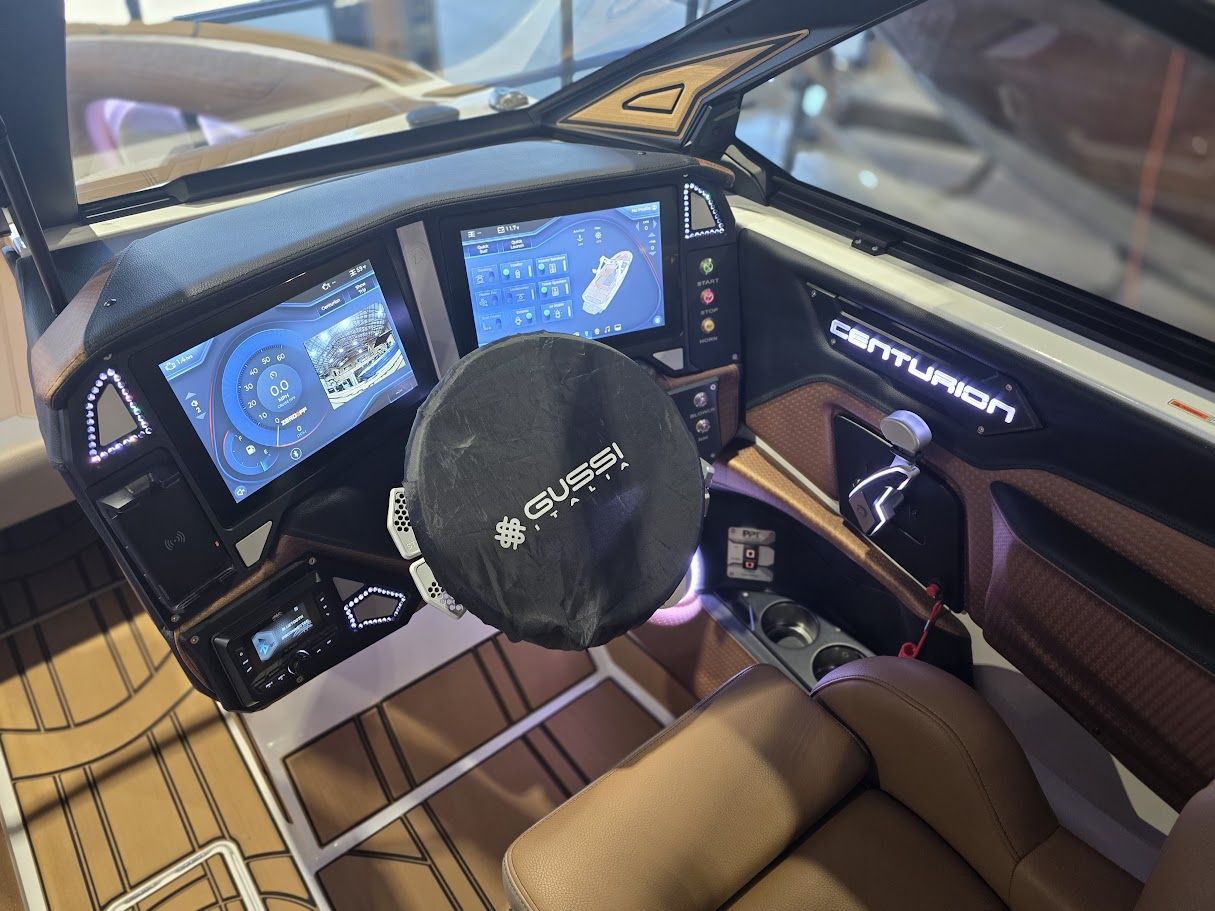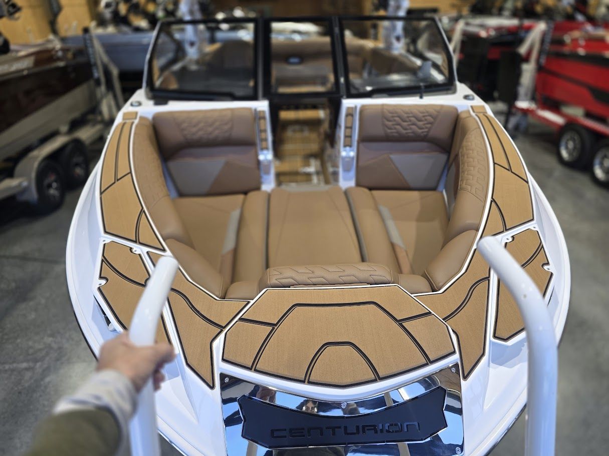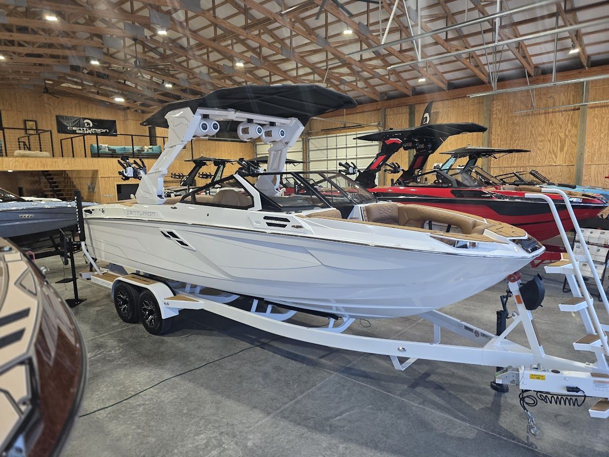 "1 USB/ 12-Volt Combo Power Outlets 4 USB/ USB C Combo Power Outlets Battery Management System w/ PDM Reset Panel Ski Pylon Stainless Steel Rub Rail Black or White Cobra Racing Driver's Seat w/Swivel and SS Flip Up Bolster Rear View Mirror 2-Interstate Battery Package with Control Center New Centurion Evo Touch Vision Dash System Knob Ops (KO) Stereo, Surf & Standard Operation New ZeroOff Pro GPS Cruise Control Depth Finder Nibral Tracking Fin Tandem Axle Boatmate Trailer: Swing Tongue, Transom Steps (16” by 12”), Underhull Spare Mount, Thinline Brake/Reverse/Turn Signal Lamps, Hydraulic Surge Disc Brakes, Heavy Duty Torsion Axles, Large Prop Guard Rollers, Ratchet Transom Straps Boatmate 15"" CORE Apex Alloy Wheels with Radial ST Tires & Black Lug Nuts New 5-Year Limited Warranty NMMA & NATM Certified" |