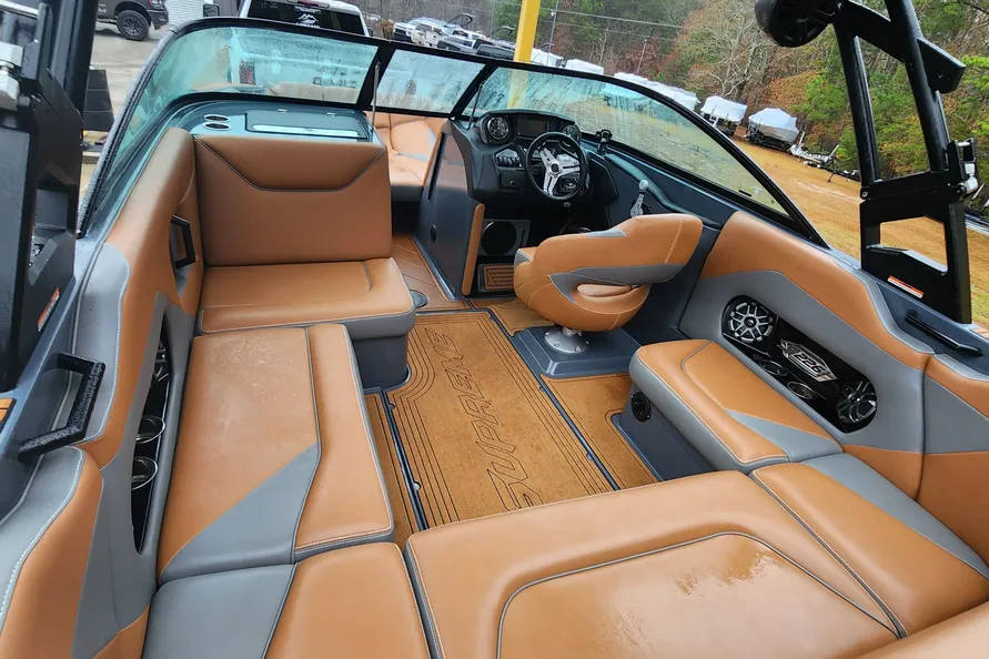 Fully loaded NXT20, Decadence tan floor, extra seadek all around rails, 4 tower speakers, heater, tinted windows, docking lights, under water lights, upgraded 5.3 closed cooled motor, 1000 hour warranty on motor, convertible seat, over tower cover, prostar steering wheel, fresh water only, surfstar, clamping board racks, cargo nets, pro surf kit, runway lights, ramp and clamp, Fiberglass Deck, spare tire, tan and black Coolfell interior..